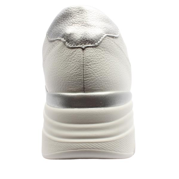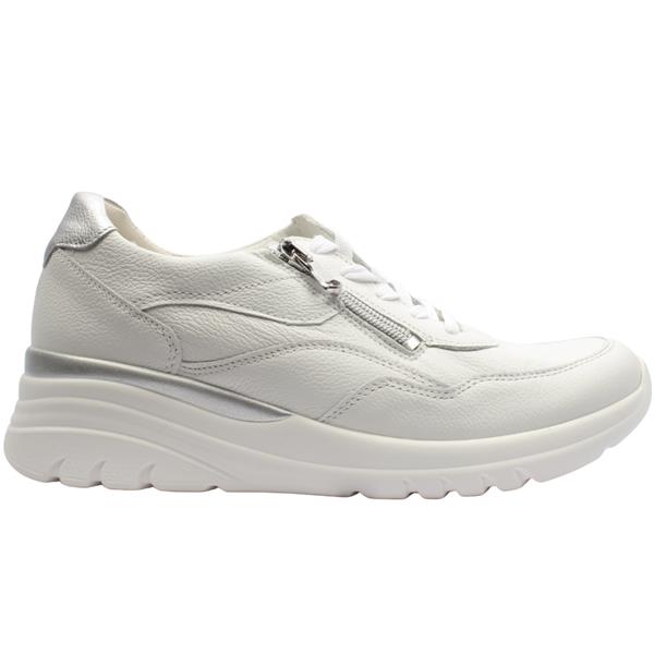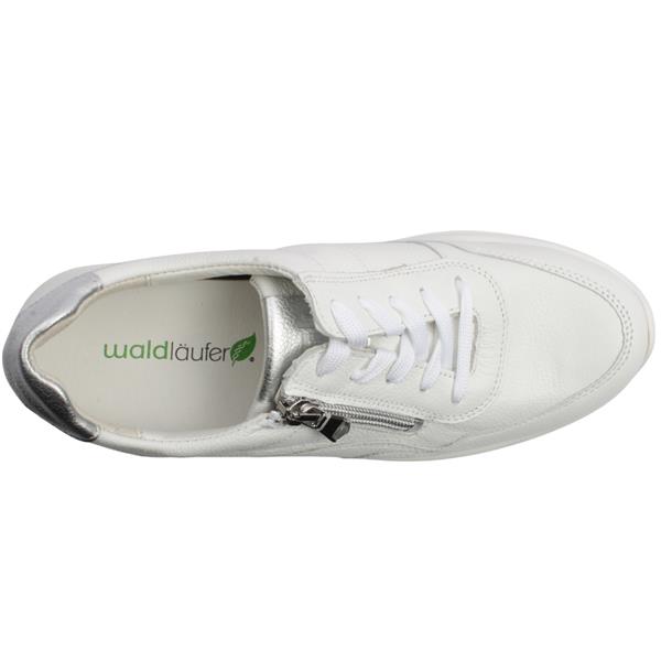 Wide Fitting ladies shoes from Waldlaufer Shoes. Style 927005 in a crisp white upper with silver accents, combines modern style with exceptional comfort. Designed with a H extra wide fitting, it offers generous space and support for all-day wear. Crafted from a soft cushioned leather upper, this shoe provides a luxurious feel and gentle flexibility. The removable leather insole allows for the use of custom orthotics, making it an ideal choice for personalized comfort. Featuring both a zip and lace closure, the Waldlaufer Carla 927005 ensures easy on-and-off convenience without compromising on fit. A small wedge heel adds a subtle lift, giving you a flattering look with stable support.
