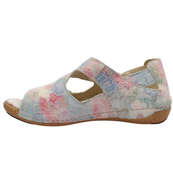 Womens wide fitting sandals from Waldlaufer shoes. Crafted from supple high quality leather in a bold and cheerful multicolour finish. Two adjustable Velcro straps across the forefoot let you customise the fit instantly. The cushioned insole is removable and secured by Velcro so you can easily swap it out for your own orthotics or preferred footbed. The enclosed heel offers added stability making these great for both strolling days out and extended wear.