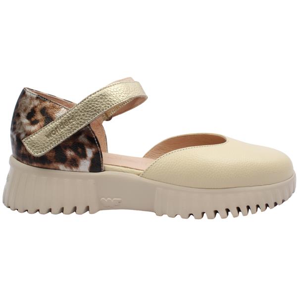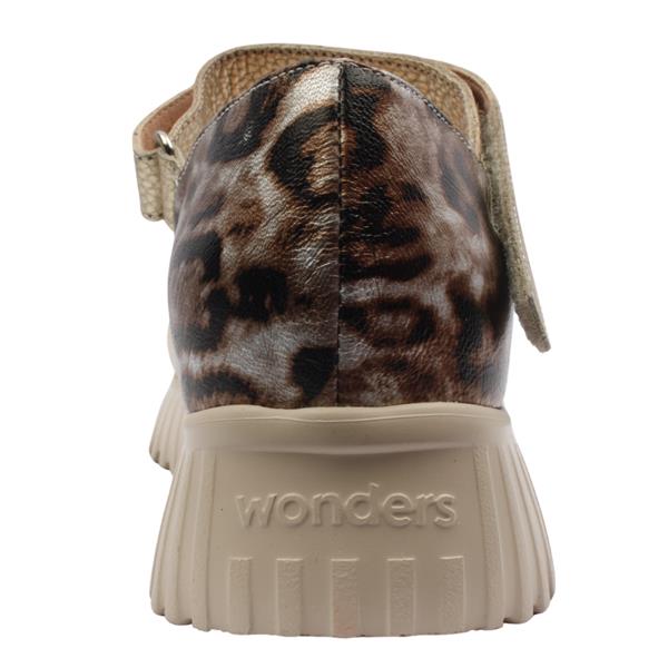 The Wonders Shoes A-4412 blends contemporary style with everyday comfort. This modern Mary Jane shoe features a smooth beige leather upper paired with a bold animal print heel counter for a subtle statement touch. The Velcro strap ensures a secure, customisable fit. Designed with Wonders Shoes signature lightweight platform sole and Memory Gel insole these shoes offer excellent cushioning and flexibility for all day wear. Perfect for elevating casual looks or adding a modern edge to smart-casual outfits.