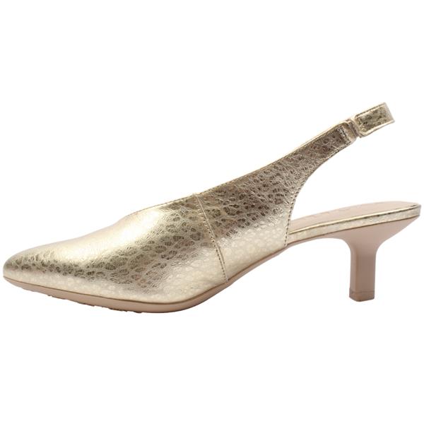 These stylish, dressy ladies slingback shoes is the perfect choice for elegant occasions. Finished in a striking gold, it features a sleek pointed toe that adds a refined, feminine touch. The elasticated slingback ensures a secure and comfortable fit, while the shaped front offers excellent foot coverage without compromising on style. Sophisticated yet wearable, this shoe is ideal for special events, evenings out, or anytime you want to add a polished finish to your look. Memory Gel Insole for all day comfort.