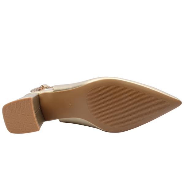 Style & comfort combine in these dressy sling back shoes from XTI Shoes. Designed for sophisticated occasions, this ladies dressy shoes feature a sleek pointed toe and a versatile gold finish that adds a touch of glamour to any outfit. The delicate slingback strap with a buckle closure ensures a secure fit on the foot. A cushioned insole and the block heel design ensures lasting comfort. Perfect for evenings out or special events.