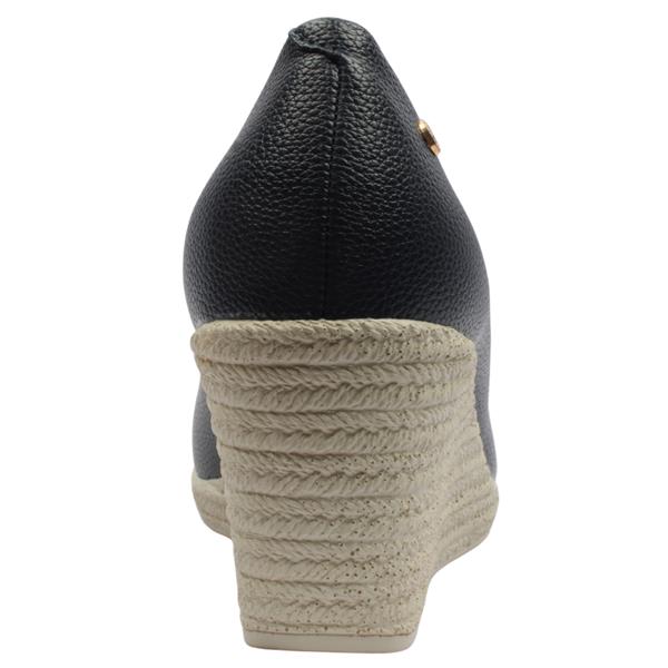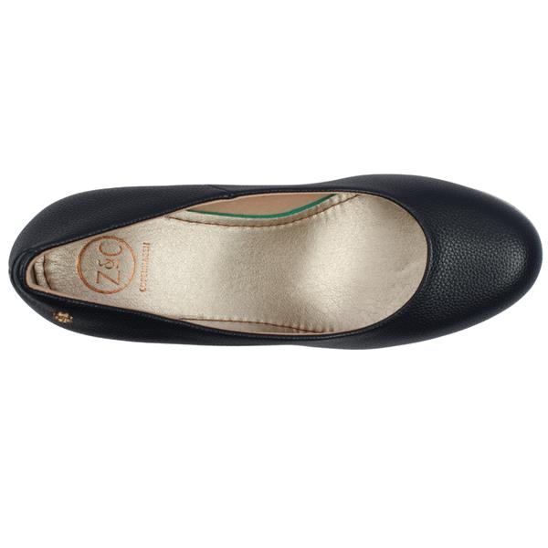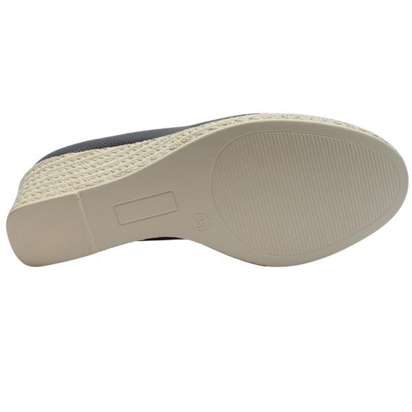 Ladies Wedge Shoes by Zanni & Co shoes, showcasing a navy upper adorned with a delicate gold Zanni & Co branded brooch embellishment on the side. Elevated by a wedge sole, these shoes prioritise both style and comfort, featuring a padded insole for enhanced cushioning.