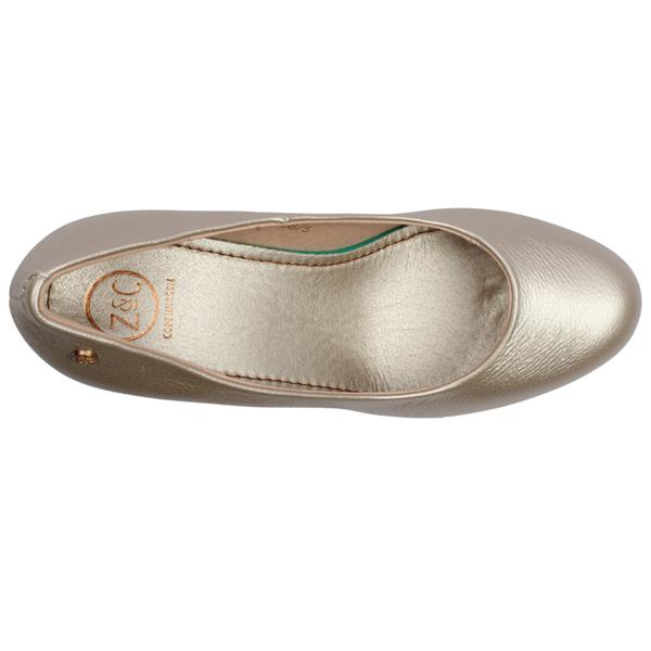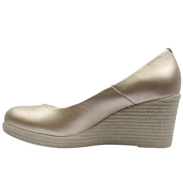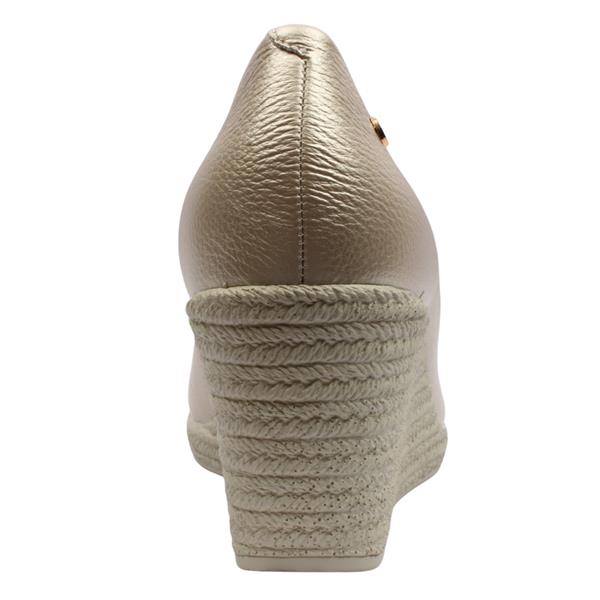 Ladies Wedge Shoes by Zanni & Co shoes, showcasing a gold upper adorned with a delicate gold Zanni & Co branded brooch embellishment on the side. Elevated by a wedge sole, these shoes prioritise both style and comfort, featuring a padded insole for enhanced cushioning.